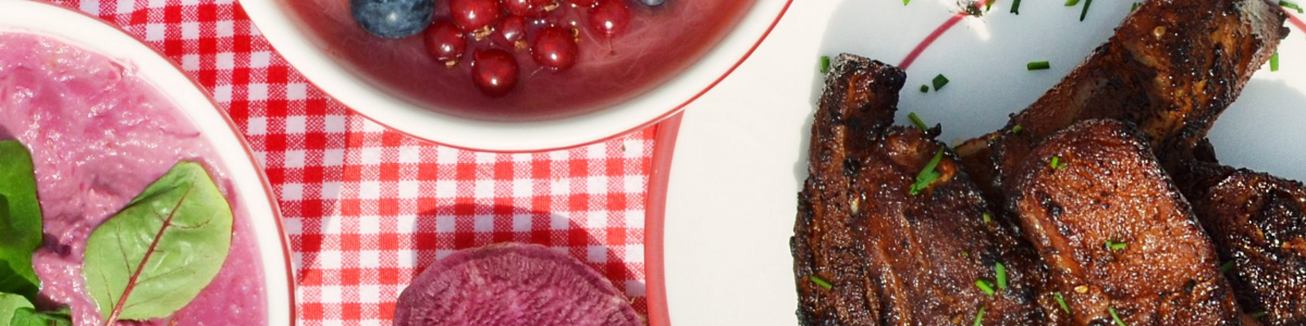 6. Serveer de spareribs mooi opgemaakt met kruiden. Zoete aardappelpuree met rabarber (rabarber, zoete aardappel, peper, zout)